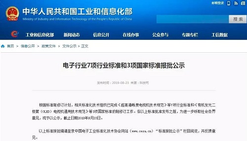 近日,工信部发文对电子行业7项行业标准和3项国家标准进行报批公示。根据标准制修订计划,相关标准化技术组织已完成《超高清晰度电视机技术规范》等7项行业标准和《有机发光二极管(OLED)电视机通用技术规范》等3项国家标准的制修订工作。在以上标准批准发布之前,为进一步听取社会各界意见,现予以公示,截止日期2019年9月23日。